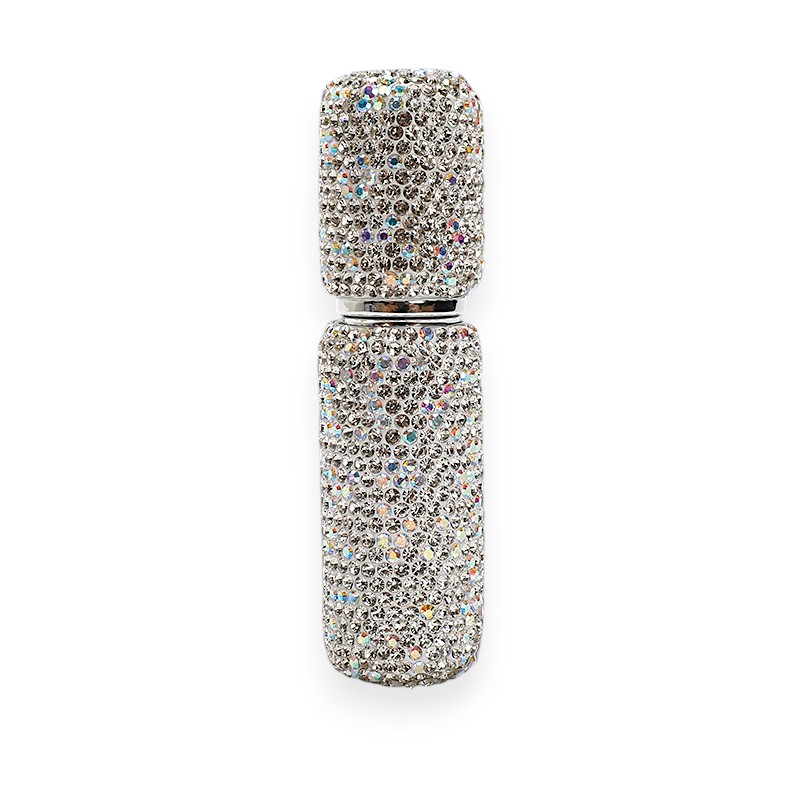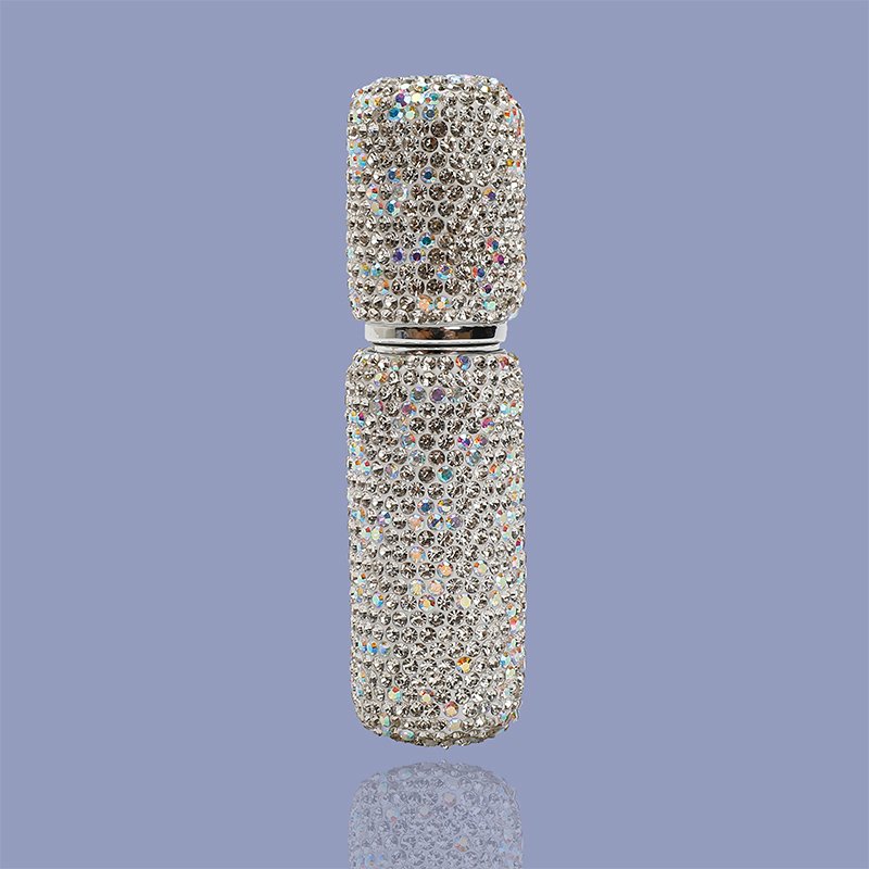 This refillable perfume bottle is covered with studded crystals that comes along with a lid with matching crystal colours.