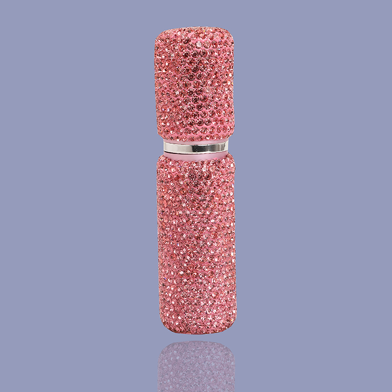 This refillable perfume bottle is covered with studded crystals that comes along with a lid with matching crystal colours.