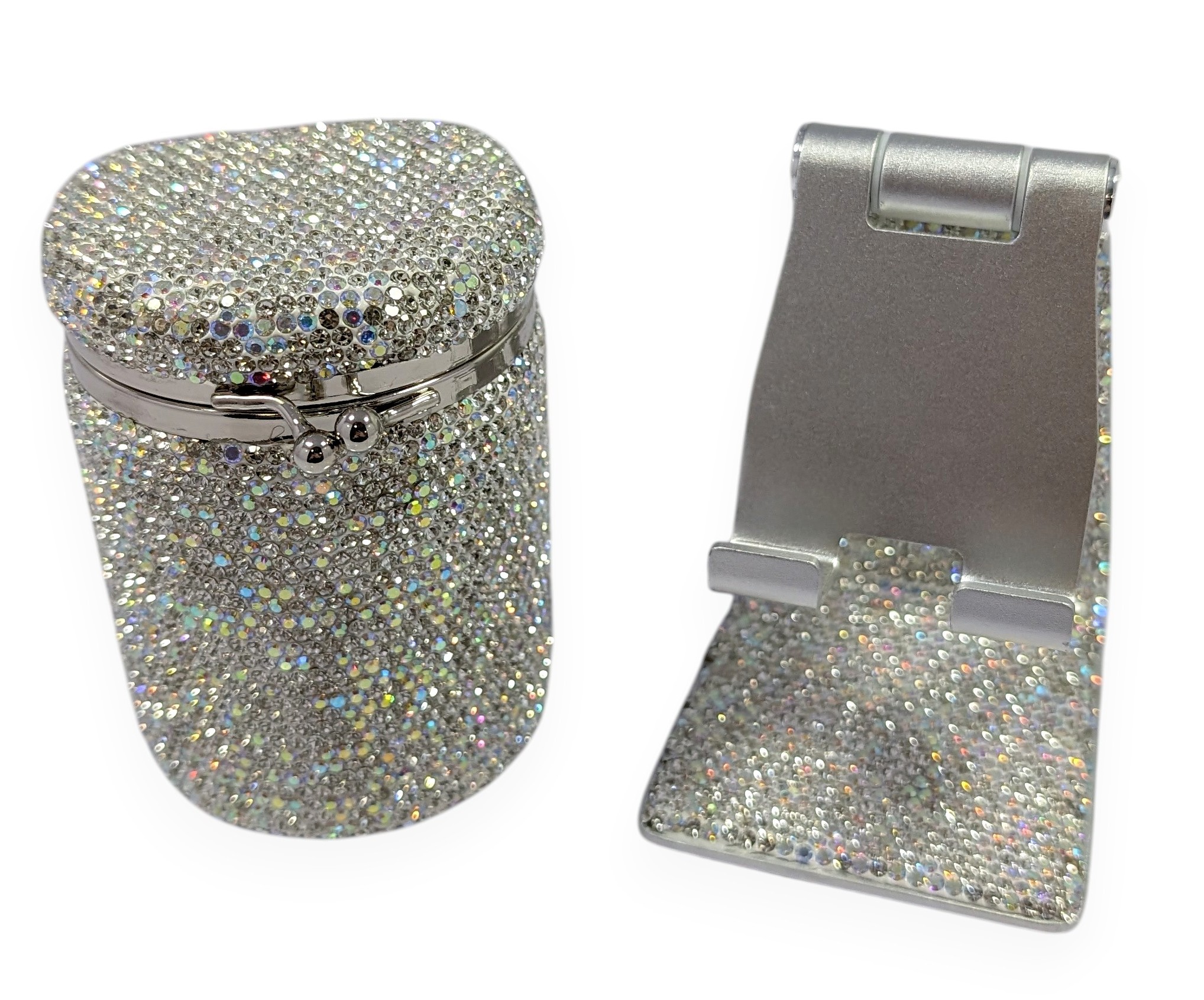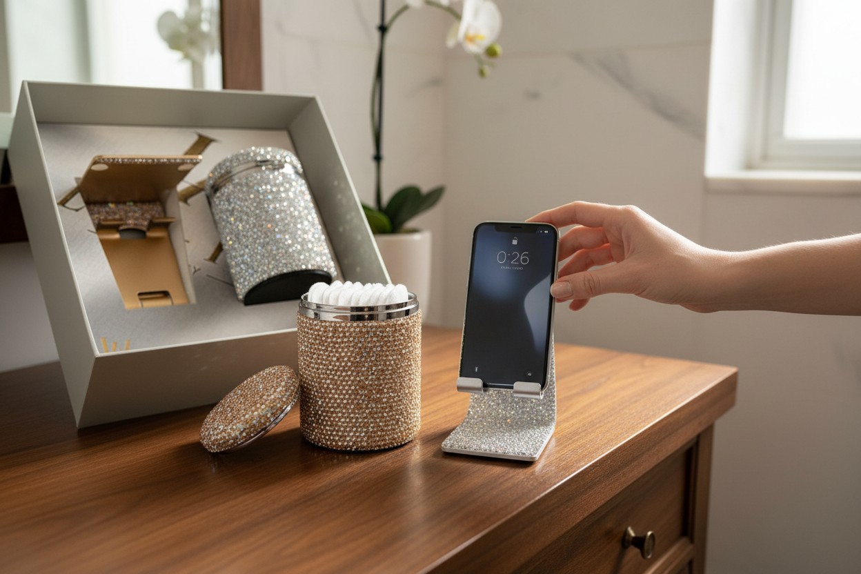 • Luxury Rhinestone Phone Holder – A shimmering, high‑quality stand adorned with radiant rhinestones. Perfect for desks, vanities, nightstands, or video calls.