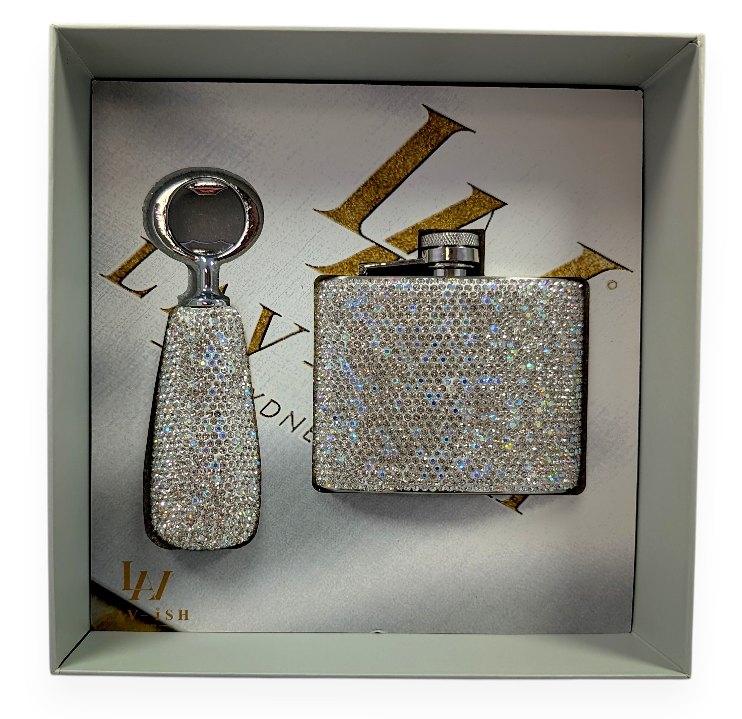 • Matching Hip Flask – Sleek, shimmering, and perfect for carrying your favourite sip in style.