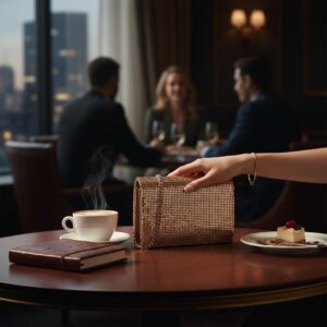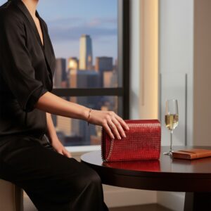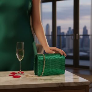 Sequin with chain and on the inside close with clutch with an inside pocket of evening bag.