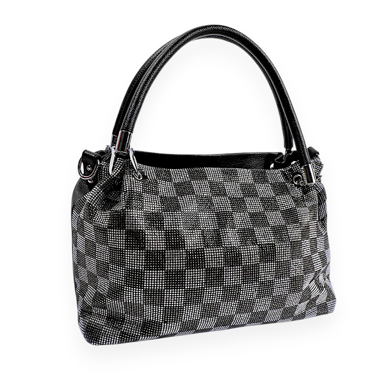 Two way Gorgeous Chequered Bling Tote Bag with full PU leather exterior and handles. Given with Zip closing and two large inner compartments separated by a zipper. Provided with detachable shoulder strap inside.