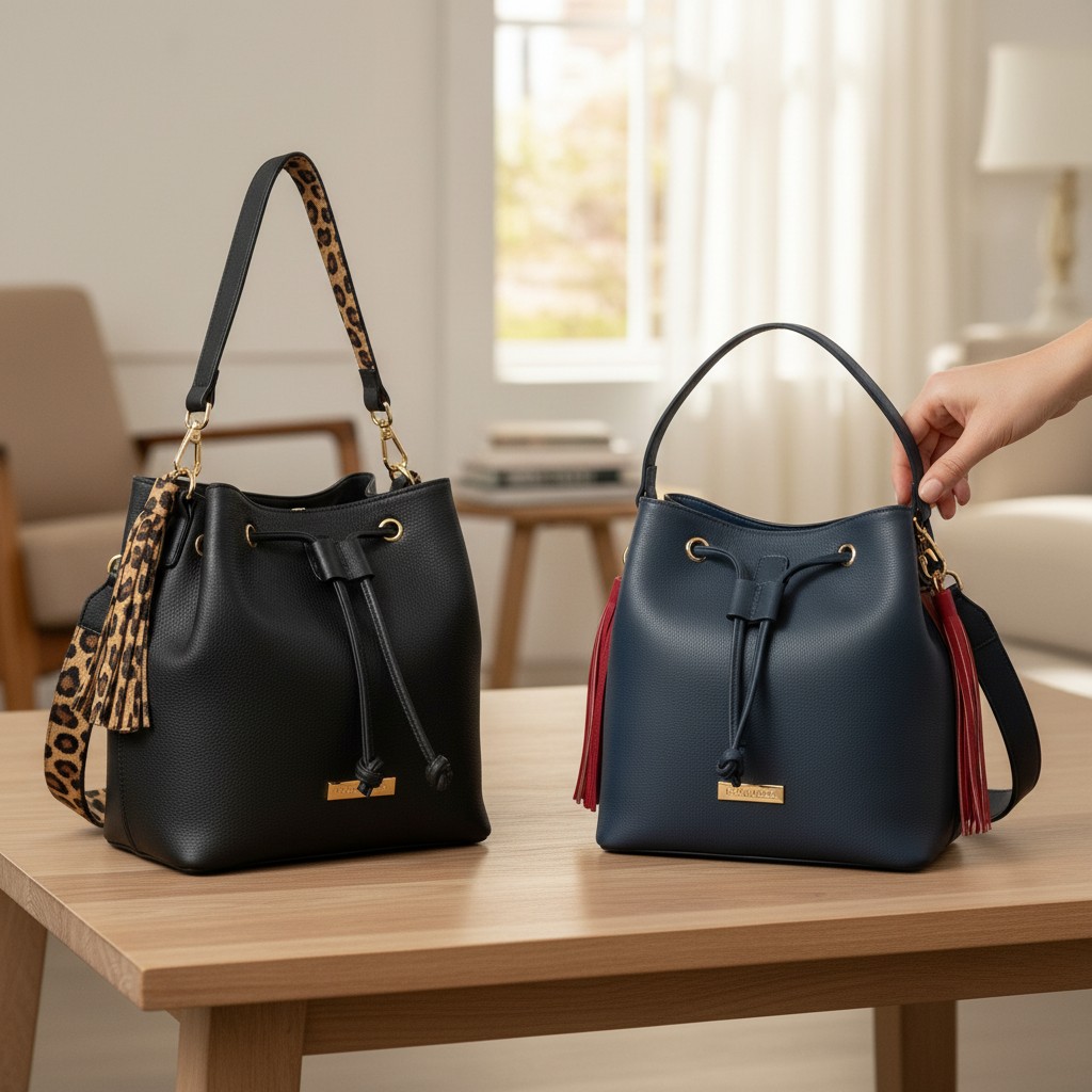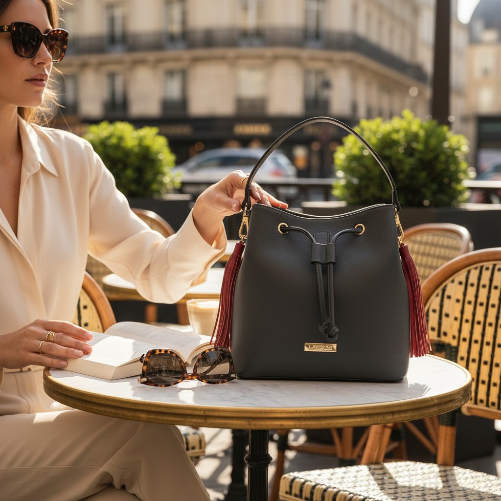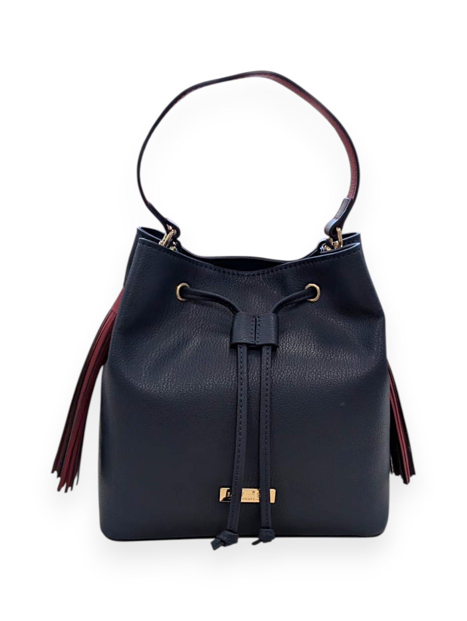 Two Tone Tassel Bucket Bag. Ruby Drop Bucket Bag