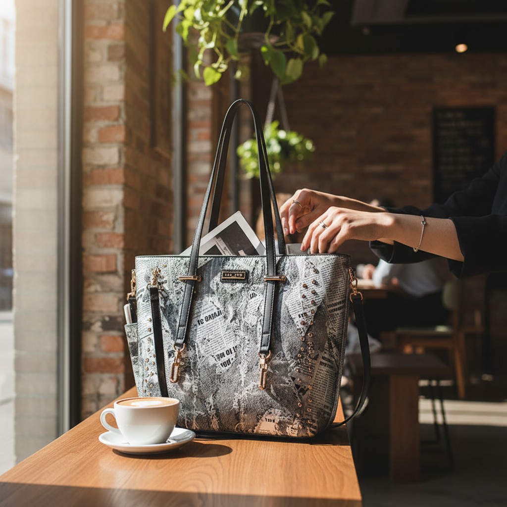 Silver Newspaper Print PU Leather Tote