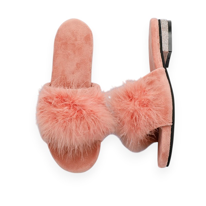 Lav-Ish slip on with Bling block short heel. Sweet slip-ons adorned with soft top-end intricate fluffy fur.