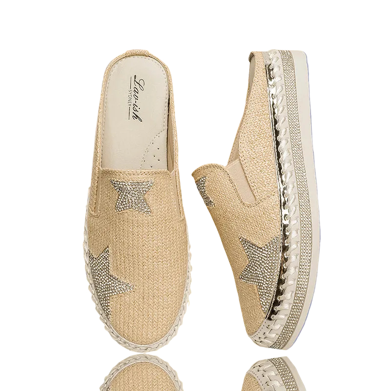 Lav-Ish Linen Woven Slides Beige Material : Linen With 4 Row Bling Rubber Sole