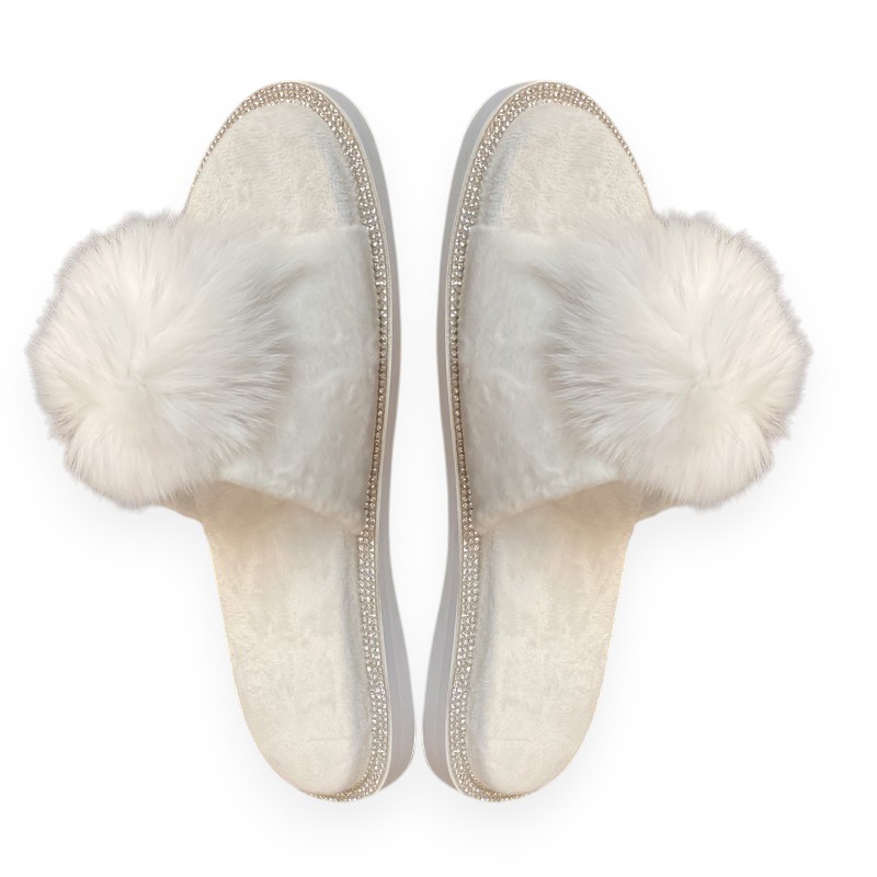 Lav-Ish White Pom-Pom slippers with rubber sole. Sweet slip-ons adorned with soft top-end intricate fluffy fur.