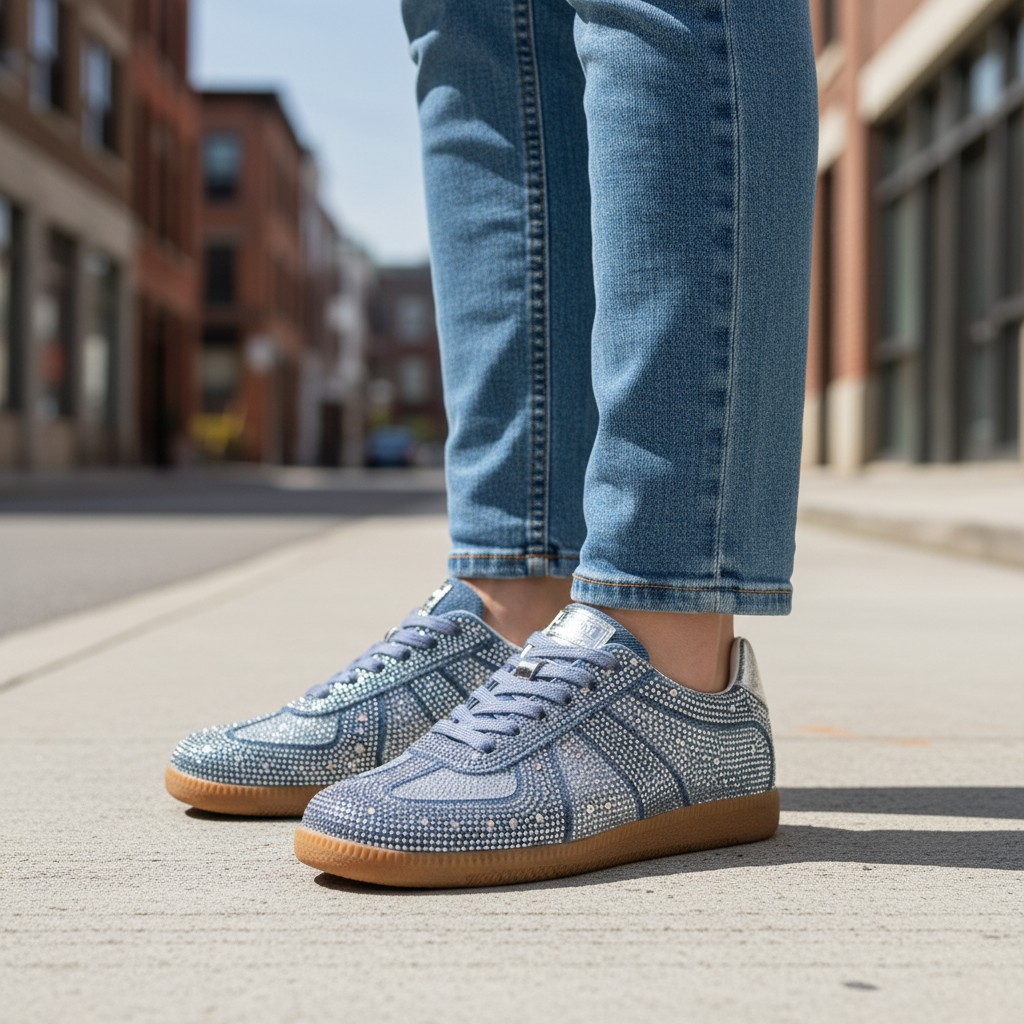 Add sparkle to your stride with these bedazzled sneakers, featuring shimmering rhinestone embellishments, chic silver accents, and a natural-coloured outsole for all-day comfort.