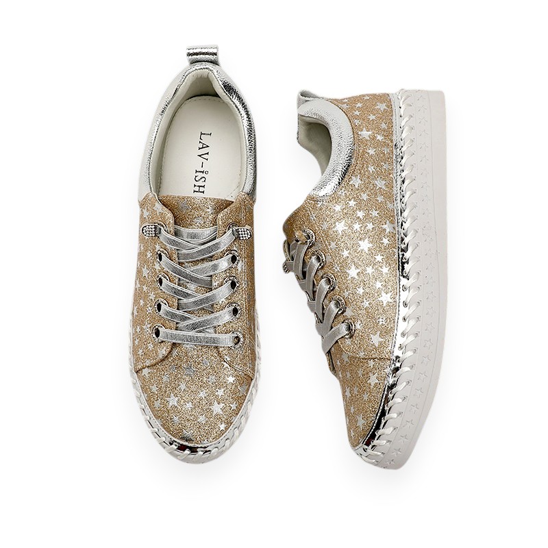 Shine with every step in these glitter metallic sneakers, featuring a silver foil star print, rhinestone lace eyelets, and a sparkling trim at the lace ends. A perfect mix of glam and casual style.