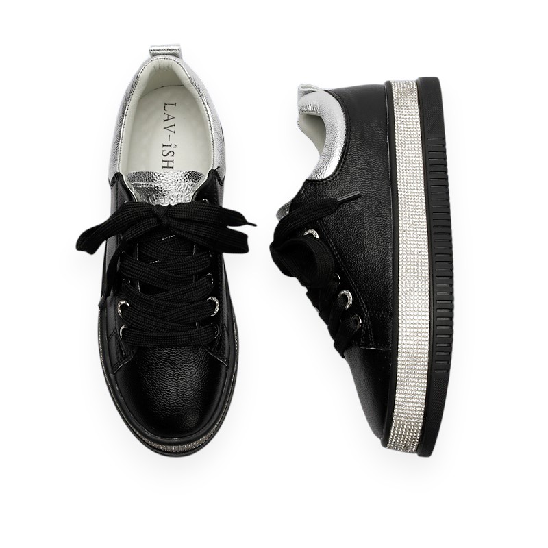 Step into luxury with these black sneakers featuring 8 rows of sparkling crystals around the sole and two diamante lace eyelets for a touch of glam. Perfect for elevating your casual style.