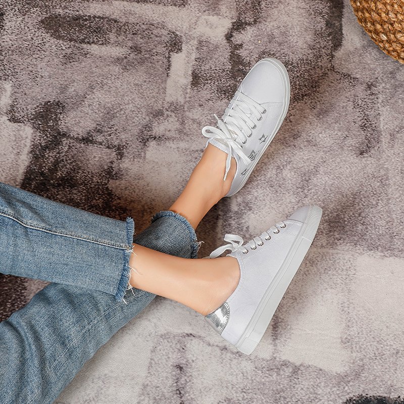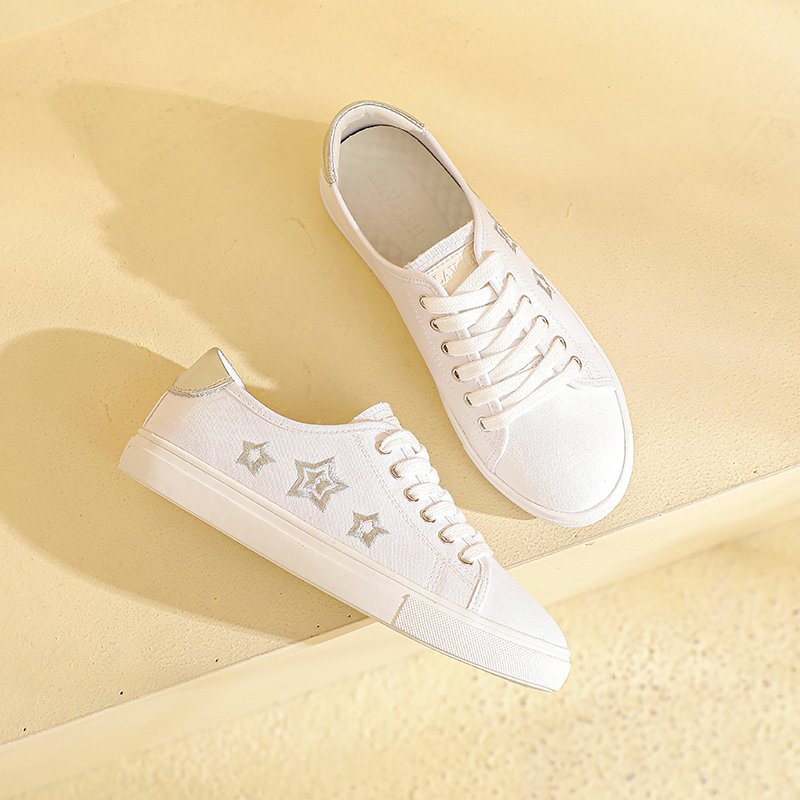 These stylish canvas sneakers feature three embroidered stars on the side and a sleek metallic heel accent for a touch of modern charm. A perfect mix of casual comfort and standout details.