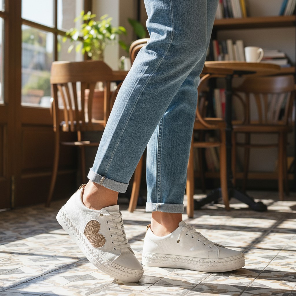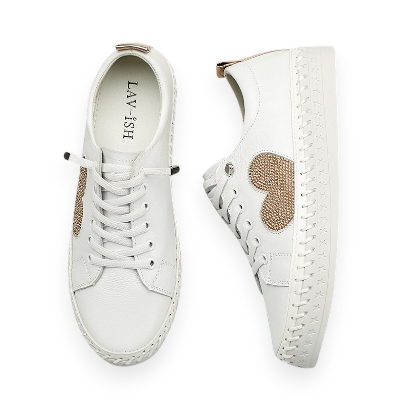 These chic lace-up sneakers feature a stunning rhinestone-embellished heart detail, adding a touch of sparkle to your everyday look. Perfect for comfort and style.