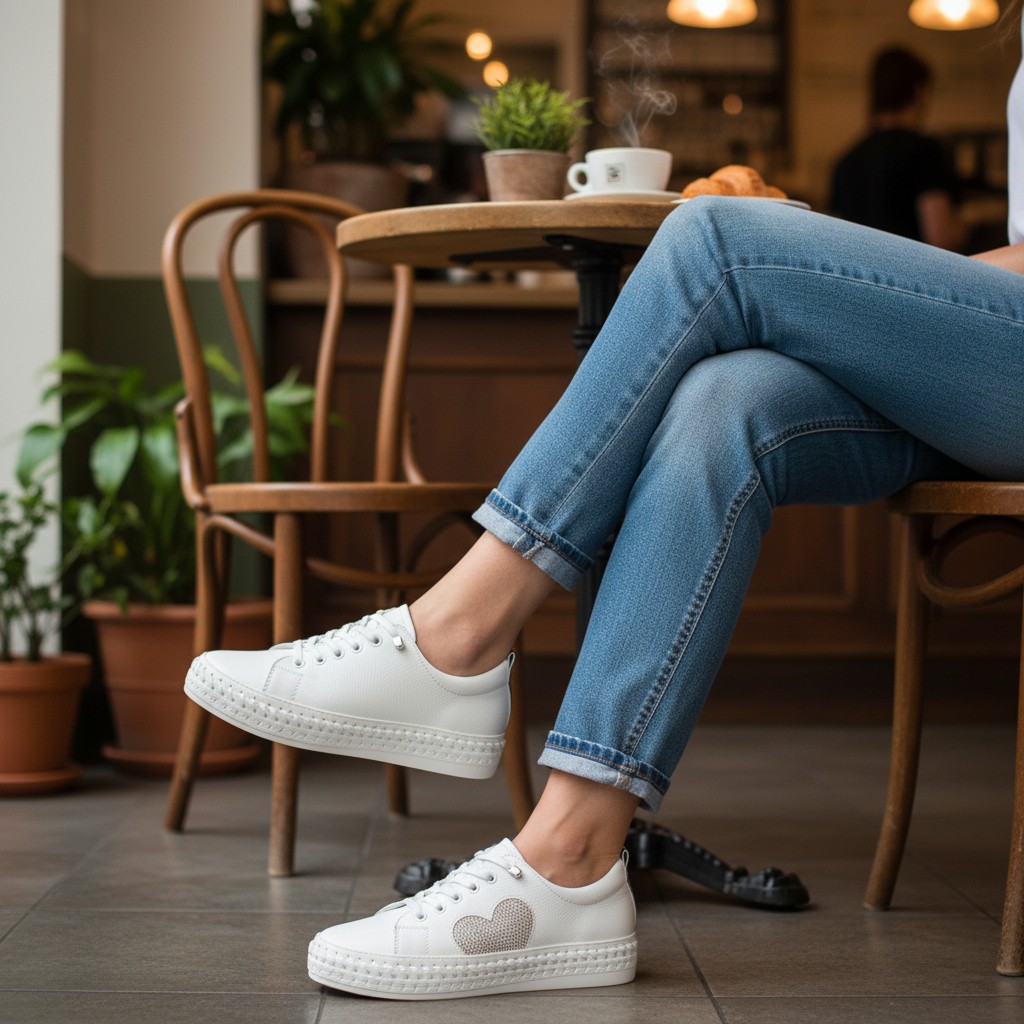 These chic lace-up sneakers feature a stunning rhinestone-embellished heart detail, adding a touch of sparkle to your everyday look. Perfect for comfort and style.