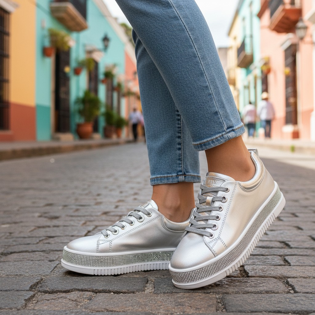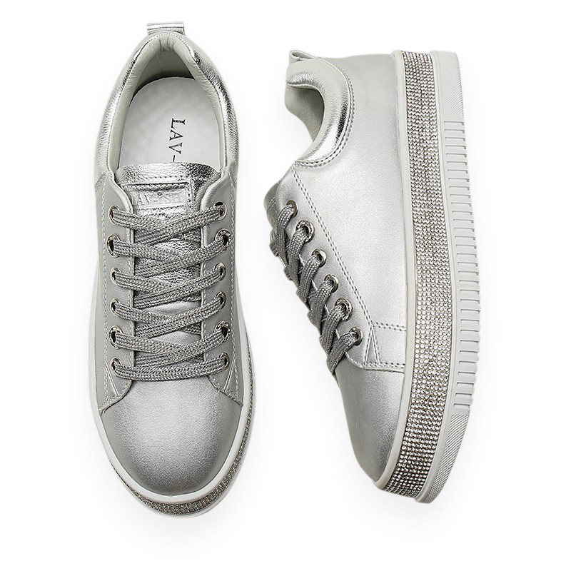 Step into luxury with these silver sneakers featuring 8 rows of sparkling crystals around the sole and two diamante lace eyelets for a touch of glam. Perfect for elevating your casual style.