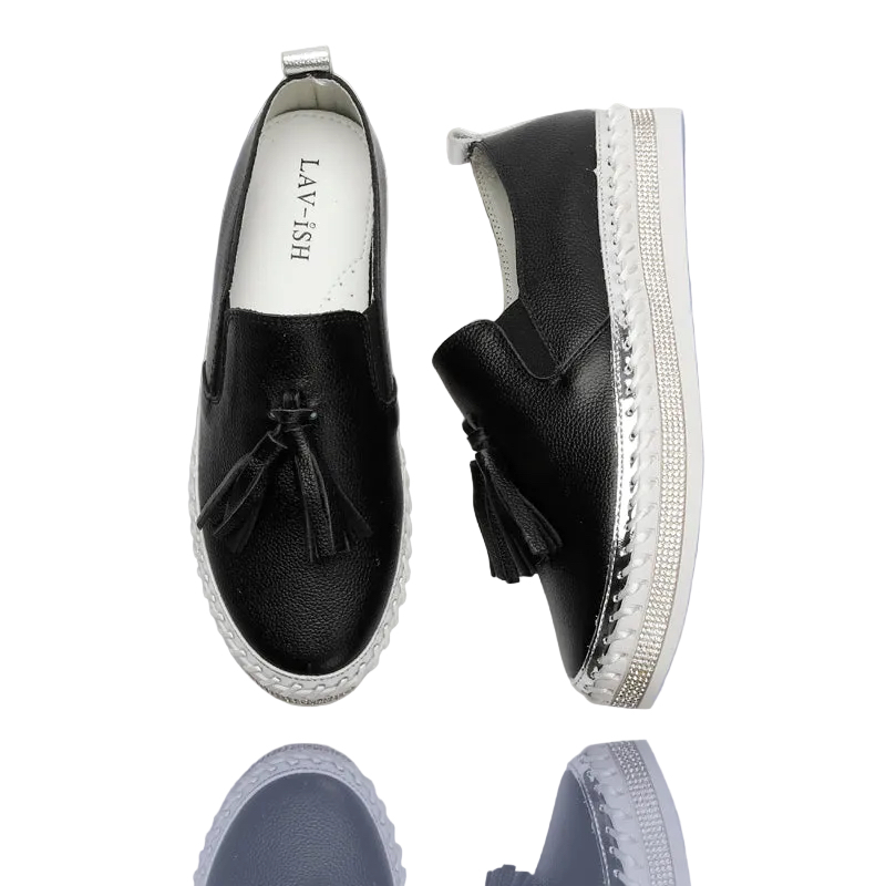Leather sneaker with Tassel Bling on side of sole with height. Colour: Black