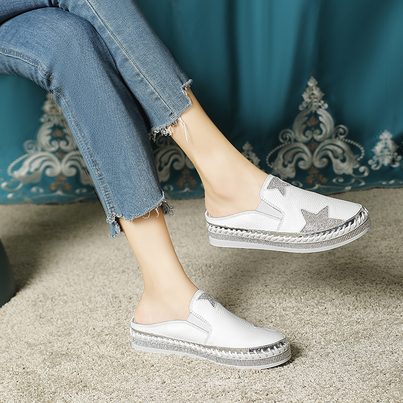Lav-Ish Genuine Leather White Slides with Bling Star