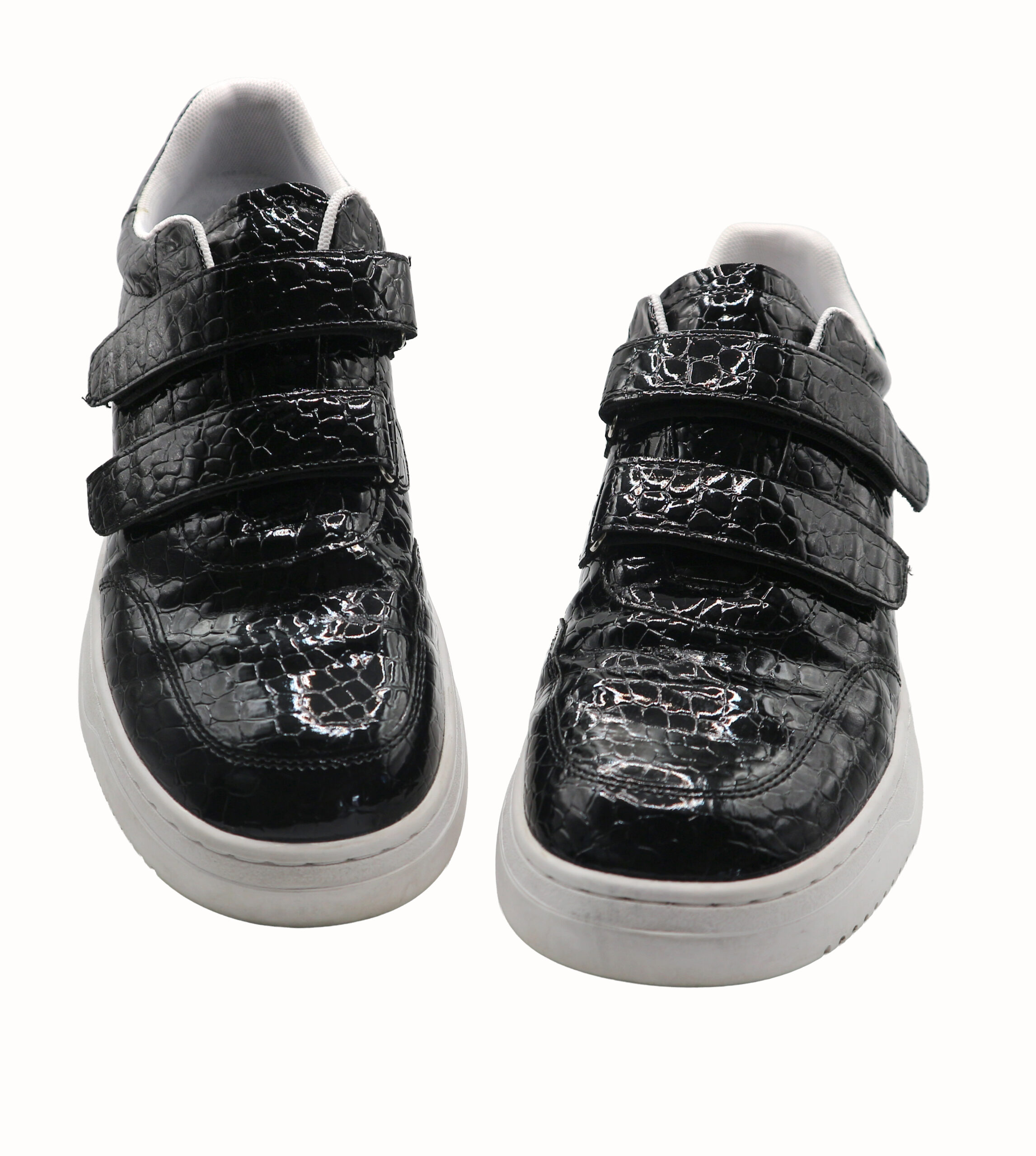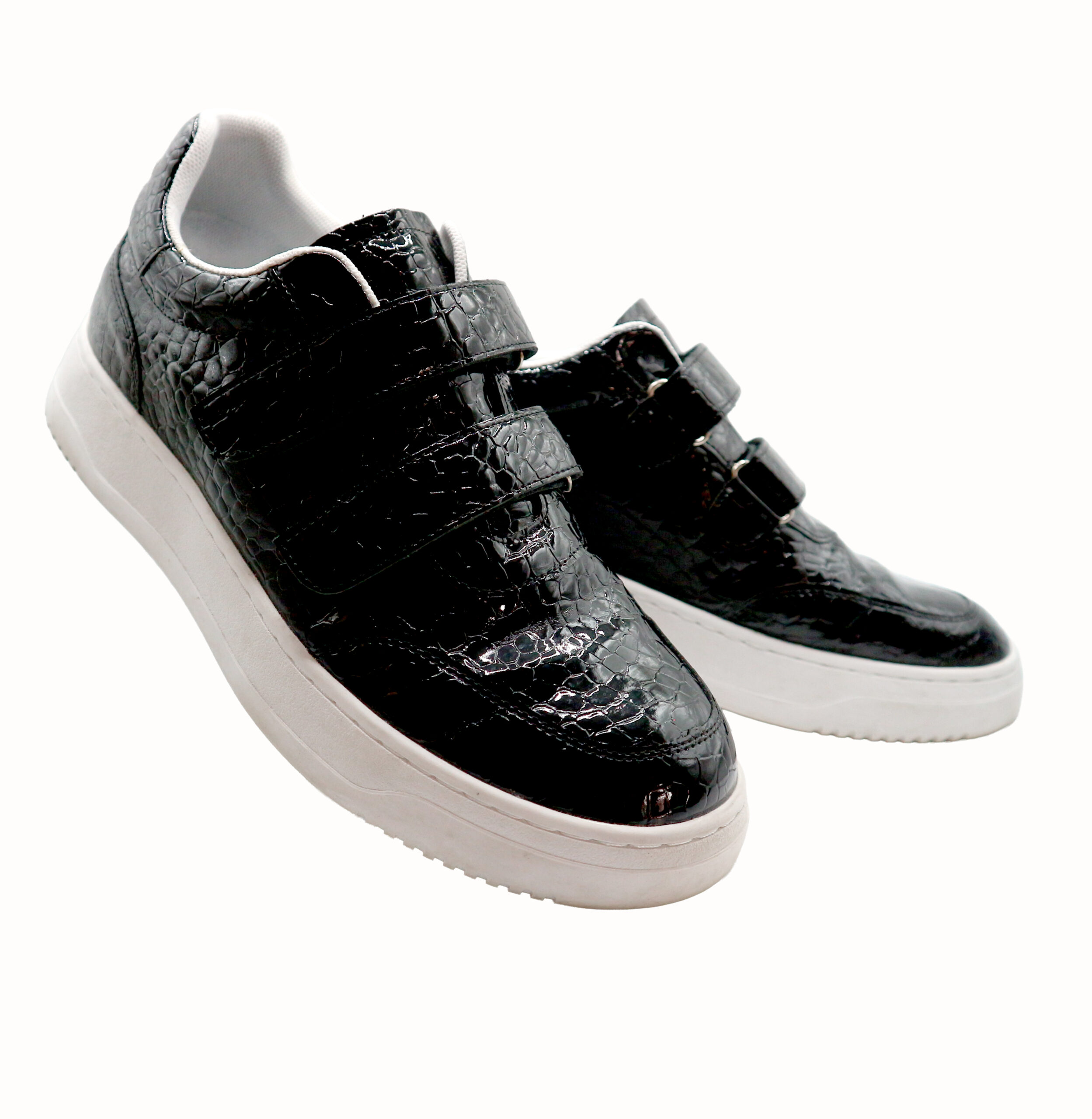 These trendy black croc-embossed Pu sneakers feature double Velcro straps for easy on and off wear and a secure fit. A perfect blend of style and comfort for everyday use.