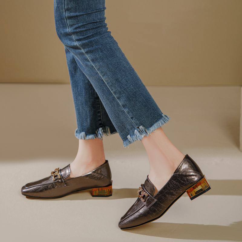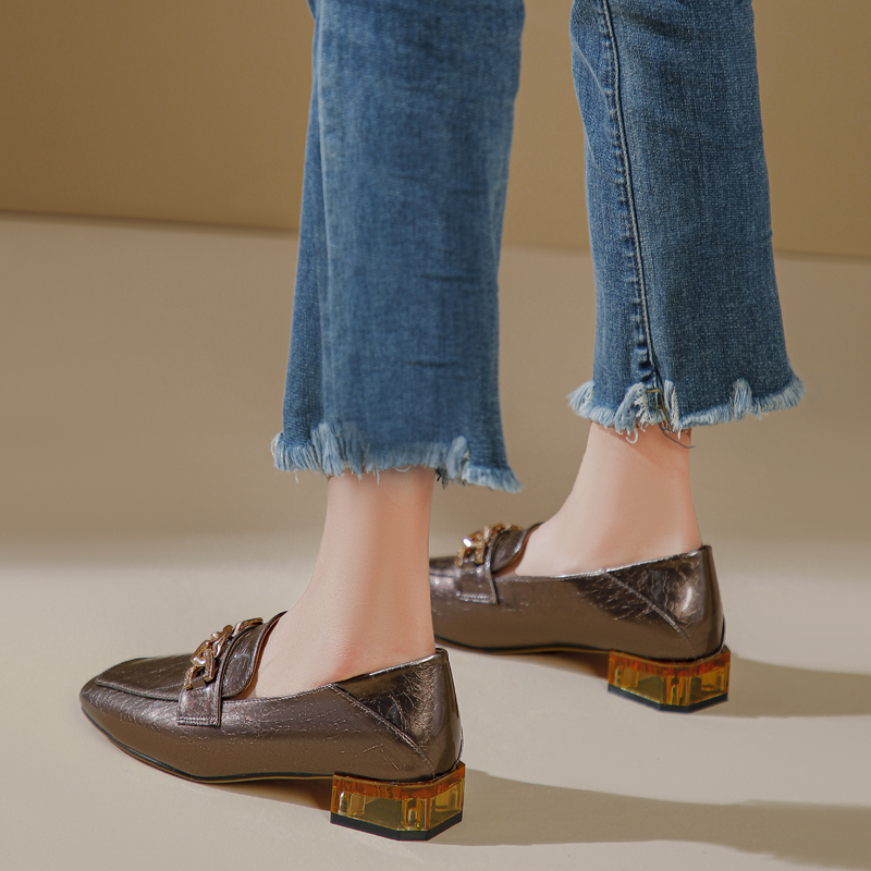 A bold statement piece, these patent PU leather loafers feature a sleek, high shine finish, a transparent heel, and a striking gold chain band on the upper. Designed for those who command attention with every step.